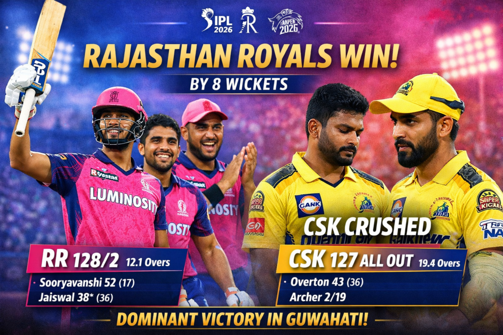 IPL 2026 का तीसरा मुकाबला Rajasthan Royals (RR) और Chennai Super Kings (CSK) के बीच Guwahati के Barsapara Stadium में खेला गया। इस मैच में Rajasthan Royals ने शानदार प्रदर्शन करते हुए Chennai Super Kings को 8 विकेट से हराकर एकतरफा जीत दर्ज की।